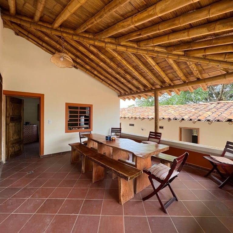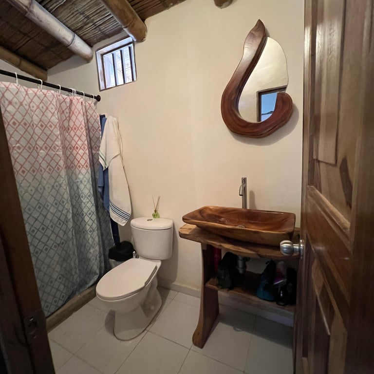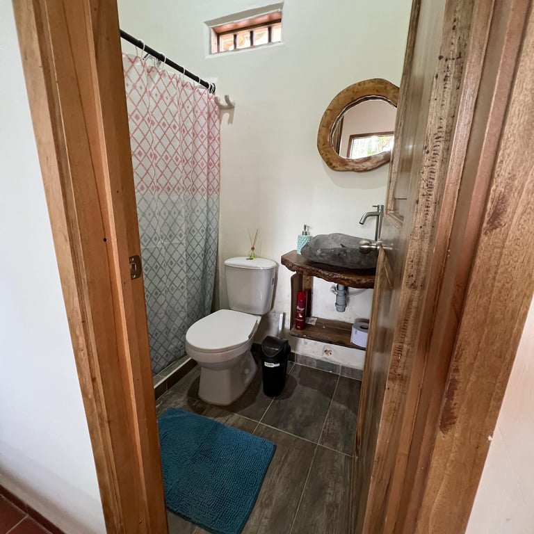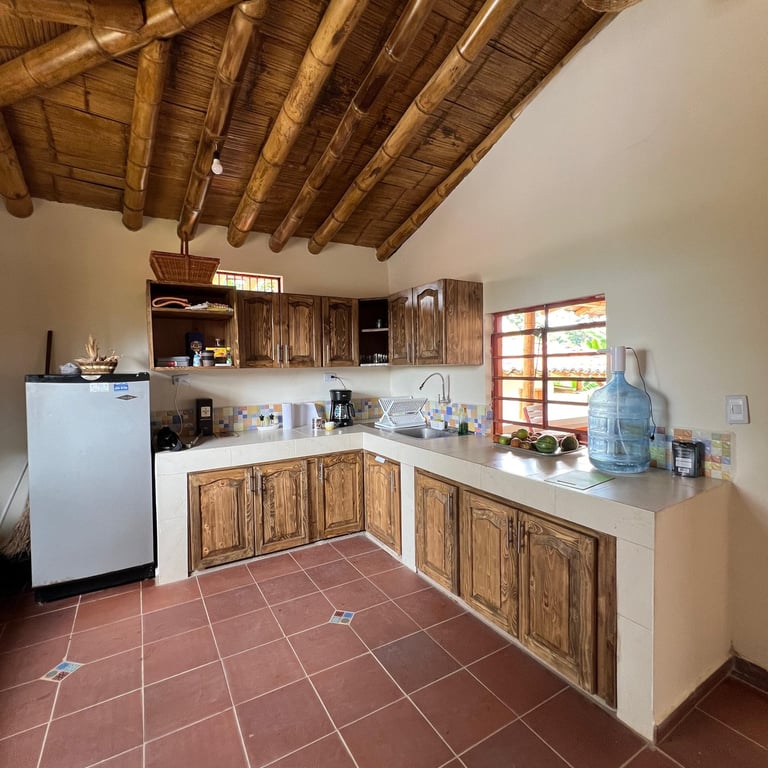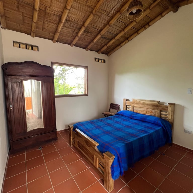 Hospédate en nuestras habitaciones inferiores, cada una con cama matrimonial y baño privado, en un entorno rodeado de naturaleza y cafetales. Disfruta de cocina compartida equipada, comedor comunitario y acceso a toda la infraestructura de la finca: senderos, zonas verdes y espacios de contemplación.